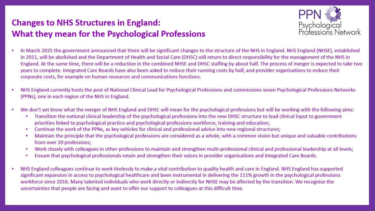 Please find Adrian Whittington's (National Clinical Lead for Psychological Professions at NHS England) response to the recent announcement from the government that there will be significant changes to the structure of the NHS in England.