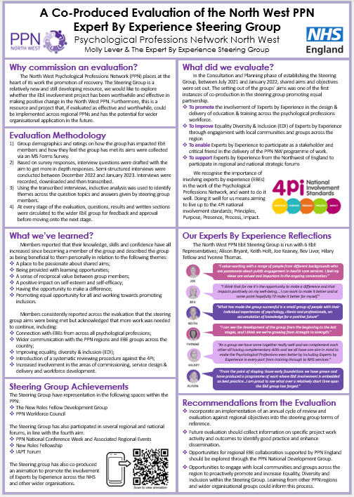 Thank you, Molly. We have been fortunate to work alongside you and we are grateful for all you have done to support the EbE group throughout the process. We now have a landmark evaluation and poster that captures the group, our aims and outcomes and importantly highlights the areas on which we need to focus as we go forward. Particularly in EDI, growing our connections and working cross regionally and in embedding an annual evaluation/ review as best practise each year. We are keen through an annual cycle of review to be aware of challenges and areas in which we need to build but also to celebrate the road we have taken and the work we have done as we look to a future where all healthcare is psychologically informed and where as EbE’s we can continue to inform, enable and influence.